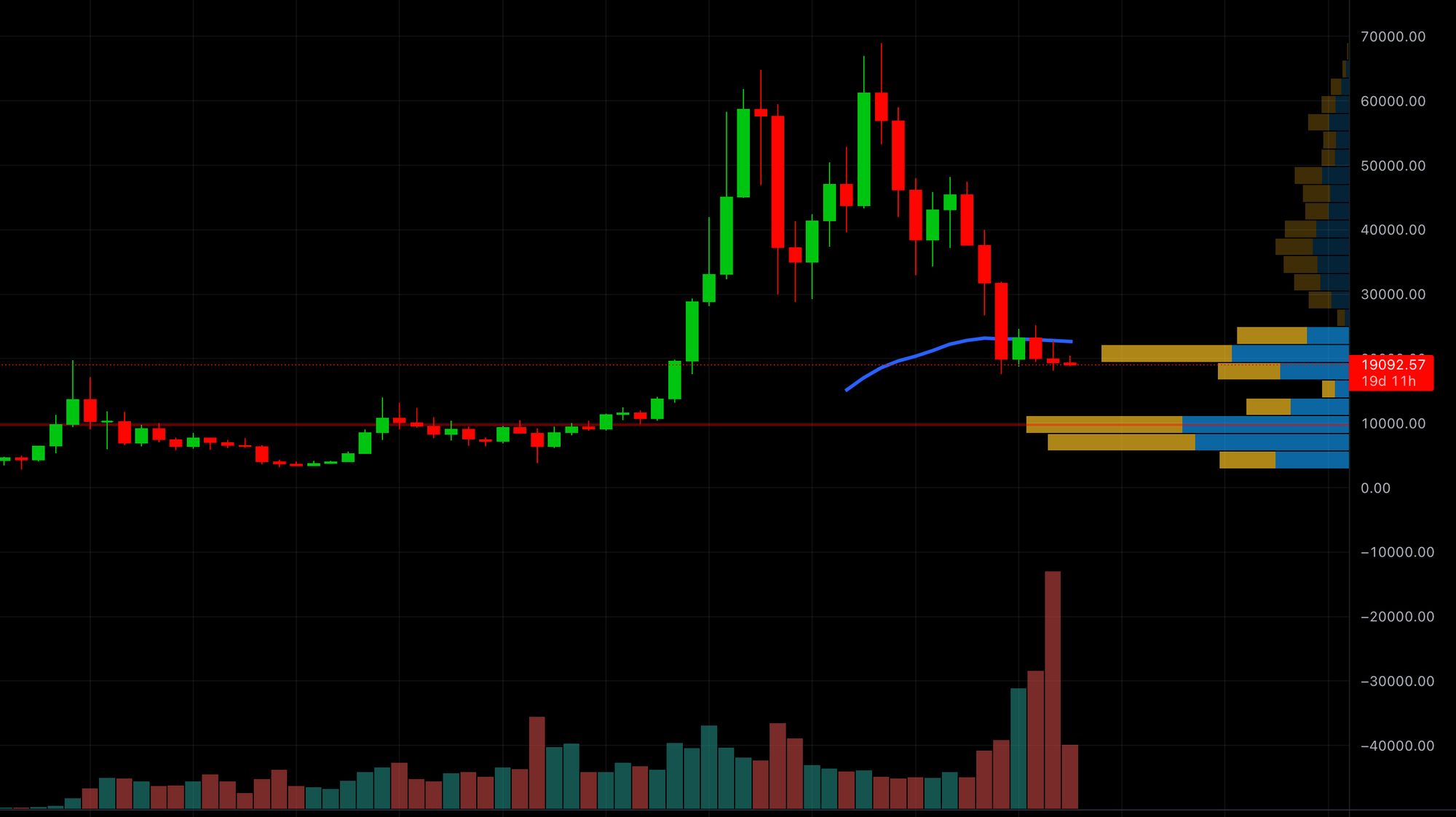 We can clearly see on the Bitcoin/USD 1 month chart the formation of a double top pattern last year showing huge selling pressure around the $68000 area. We can also see how the highest point of 2018 is acting as a support for the price today.